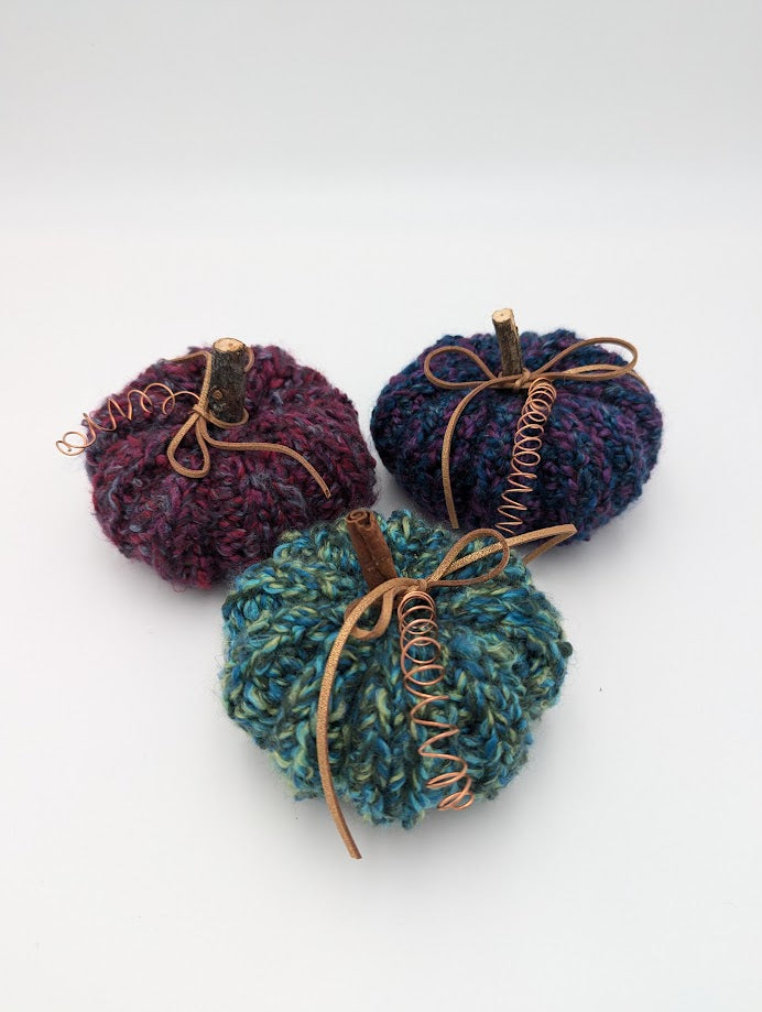 Yarn pumpkins in 3 different colors, with copper and wood/cinnamon décor